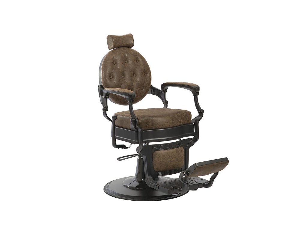 Sofistikovaná holičská židle s celokovovým rámem ze vstřikovaného hliníku. Kulatá základna a kompletní konstrukce s matně černou povrchovou úpravou. Oboustranná podnožka. Vysoce kvalitní hydraulické čerpadlo. Sedák s pěnou vysoké hustoty pro maximální pohodlí a odolnost. Hnědé čalounění.