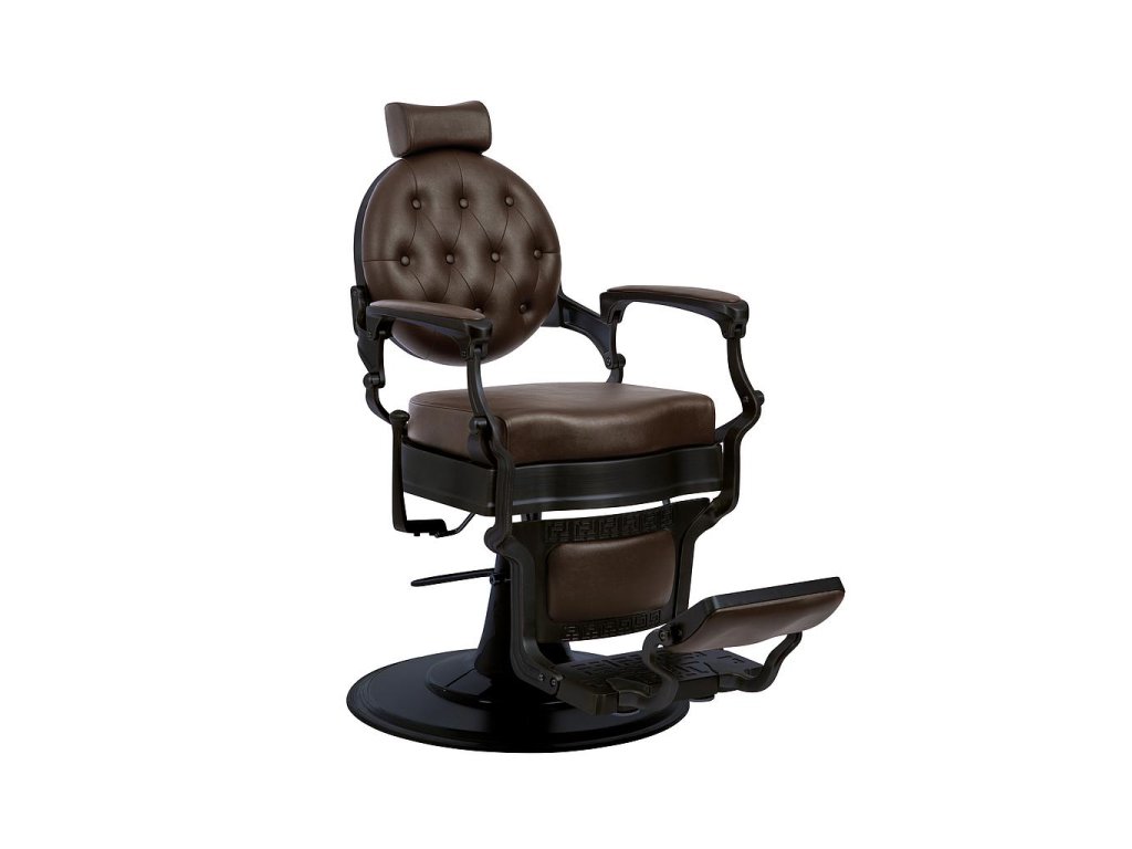 Sofistikovaná holičská židle s celokovovým rámem ze vstřikovaného hliníku. Kulatá základna a kompletní konstrukce s matně černou povrchovou úpravou. Oboustranná podnožka. Vysoce kvalitní hydraulické čerpadlo. Sedák s pěnou vysoké hustoty pro maximální pohodlí a odolnost. Tmavě hnědé čalounění.
