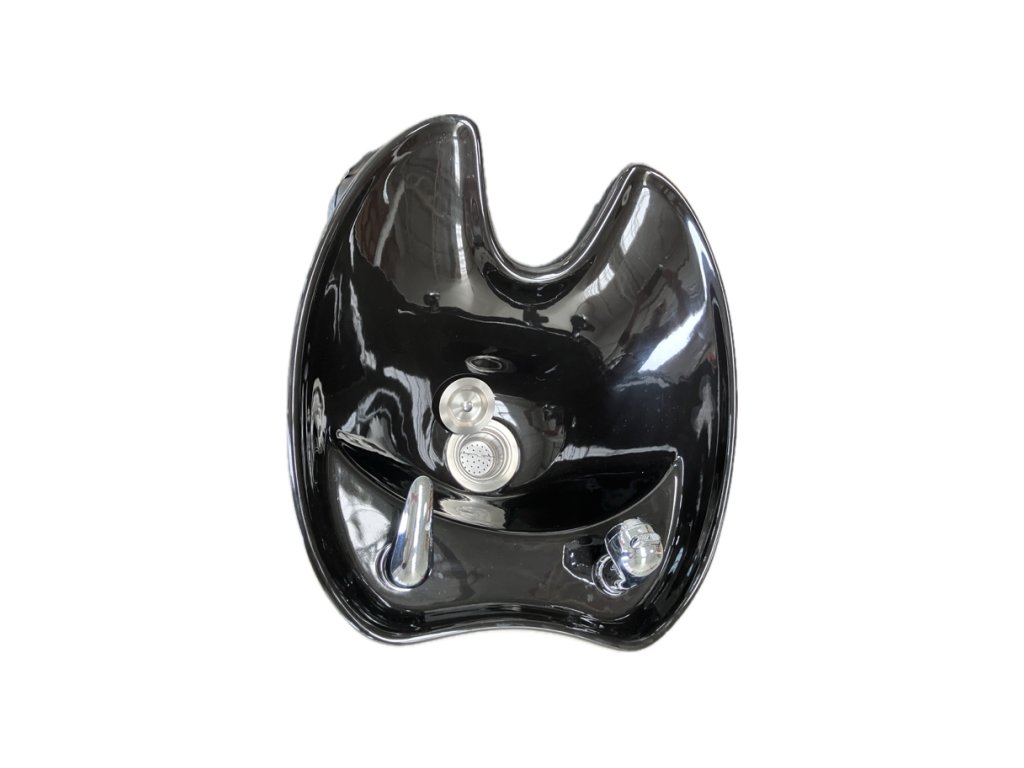 Keramická mycí mísa v černém lesklém provedení je naklápěcí a vybavená baterií a sprchou.