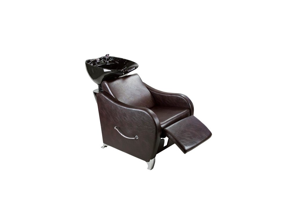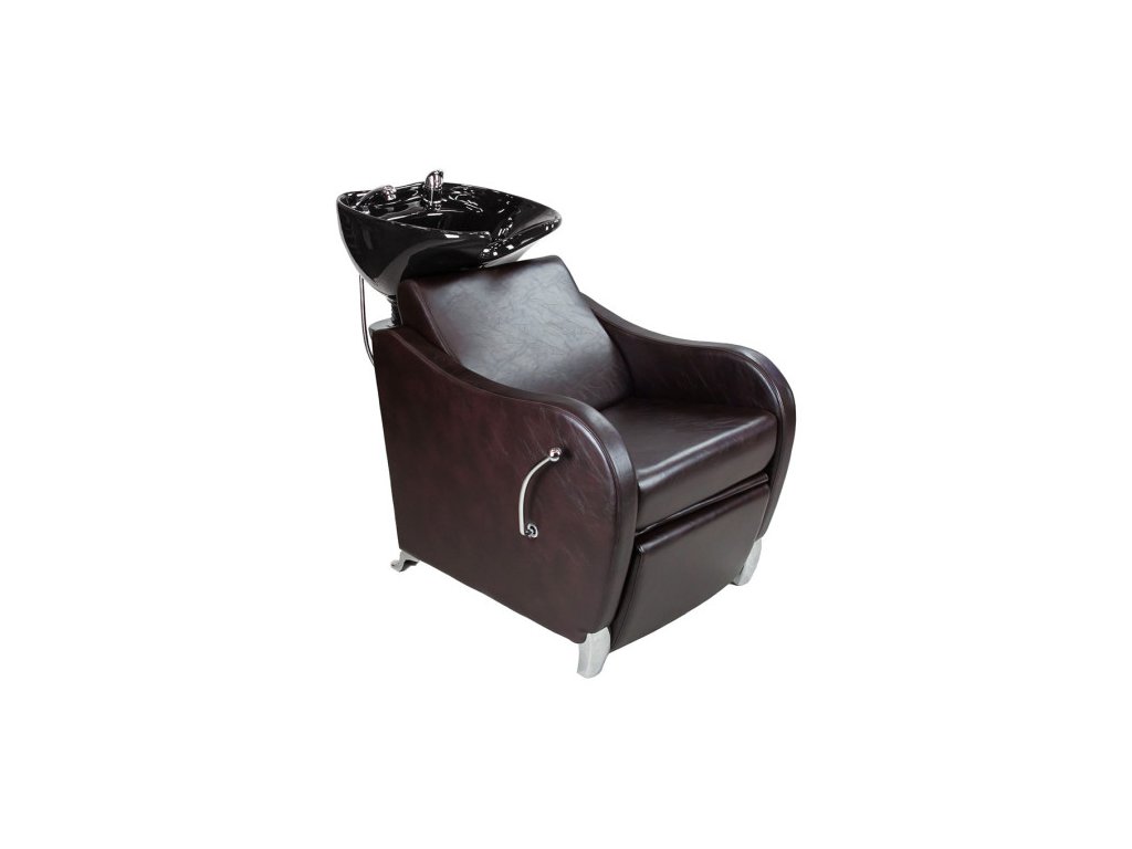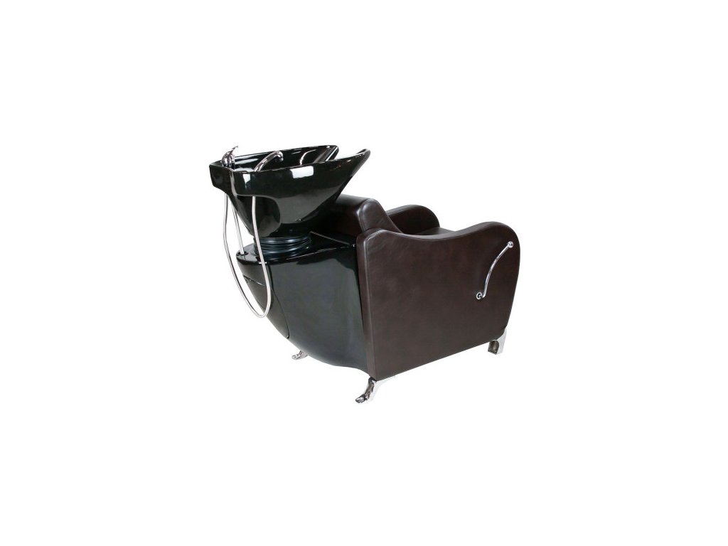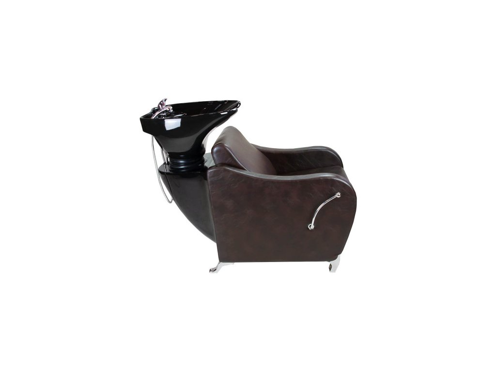 Komfortní mycí box GLAMI v robustním stylu s hlubokým keramickým umyvadlem, kovovými nohami a čalouněnými područkami. Sedadlo je měkké a pohodlné. Ideální pro rušné kadeřnické salony nebo holičství.