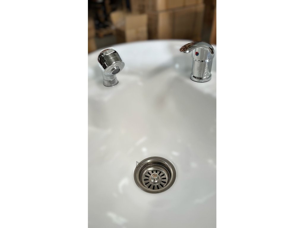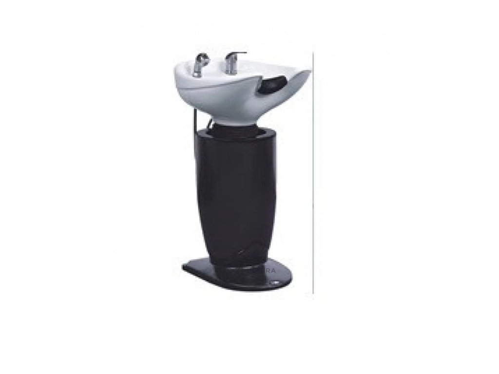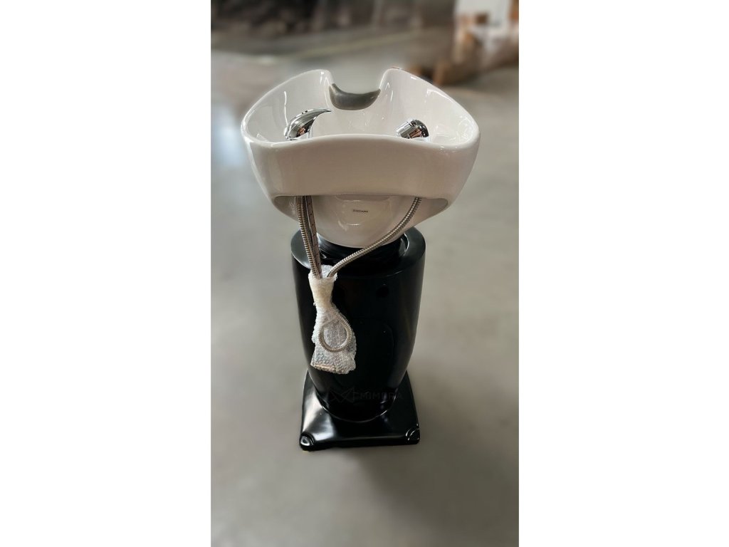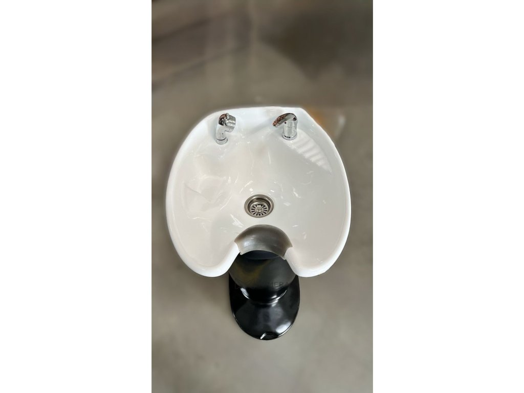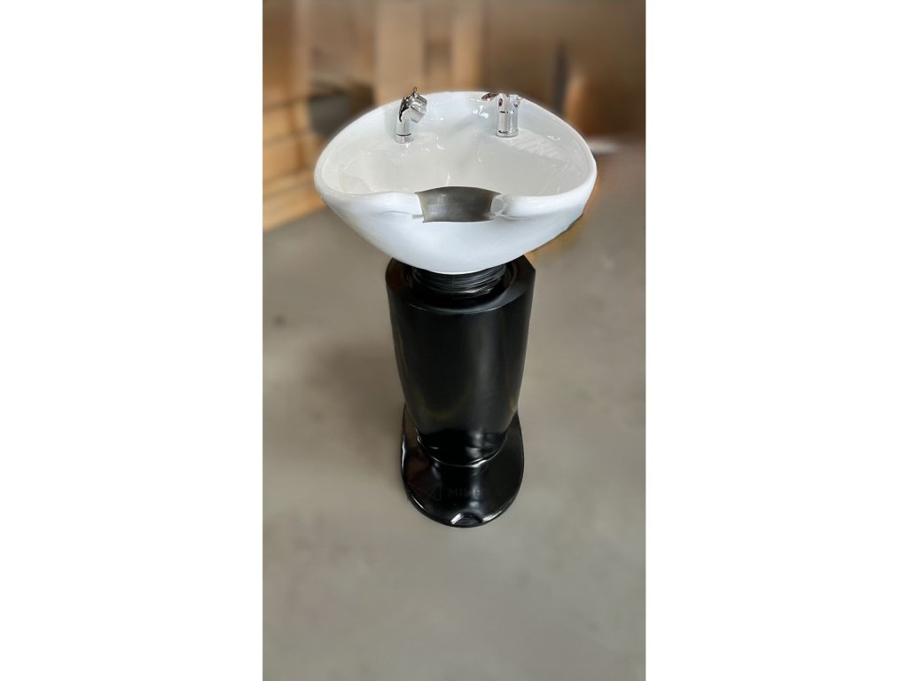 Keramické umyvadlo s ergonomickým tvarováním nabízí pohodlnou oporu pro krk klienta, zatímco gumová opěrka na krk snižuje tlak a zvyšuje komfort během celé procedury. Robustní laminátový podstavec zajišťuje vysokou stabilitu a odolnost při každodenním používání. Součástí stojanu je také páková baterie a ruční sprcha, které umožňují přesné a jednoduché nastavení proudu a teploty vody.