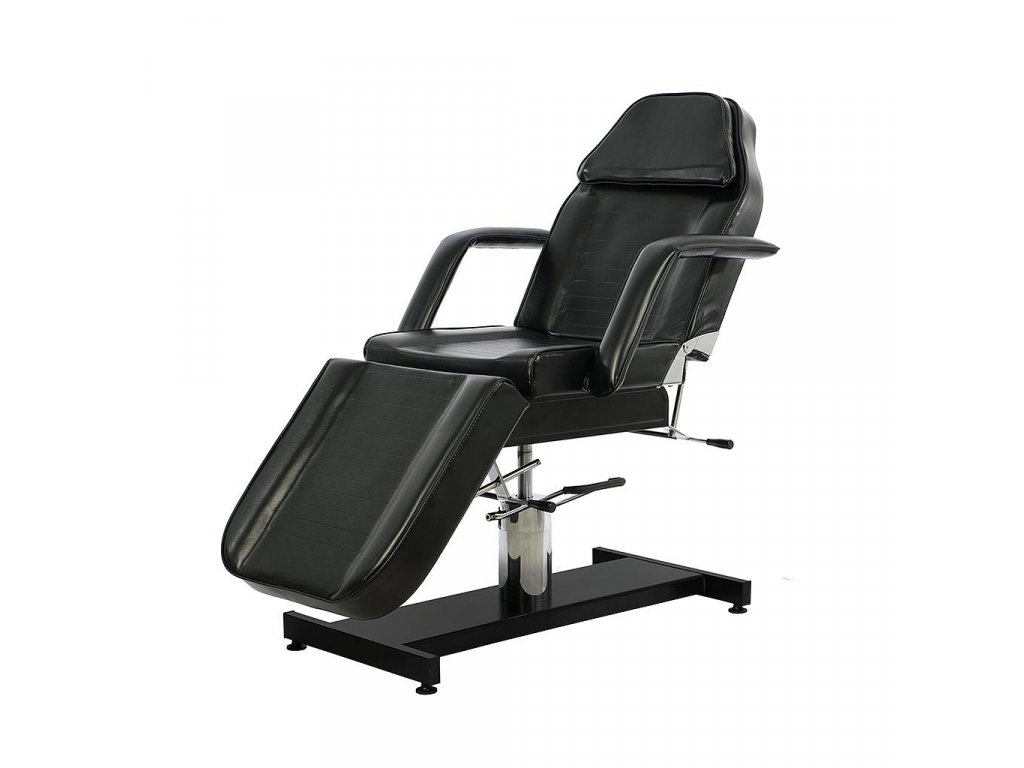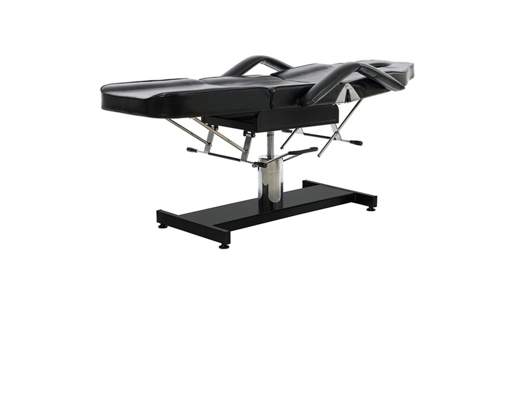 Funkční třídílná židle s lakovaným kovovým rámem, vybavená hydraulickou pumpou, která ovládá výšku. Sklon opěrky zad a nohou je ručně nastavitelný. Odnímatelné područky. Bílé nebo černé čalounění z PVC se snadno čistí.