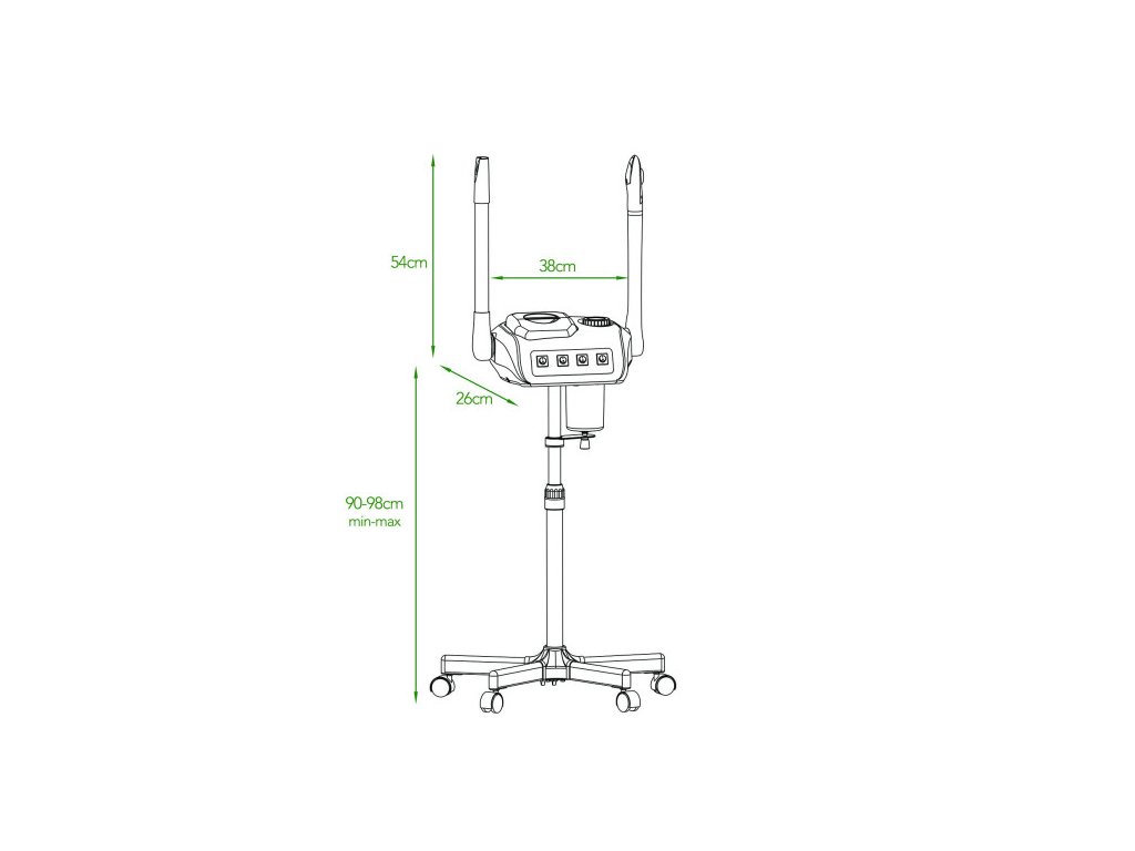 Napařovač a chladící mlha jsou integrovány do jednoho stroje. Dvě ramena umožňují, aby systém péče o pokožku pracoval současně. Stroj má funkční design s nádobou na aromatické oleje, nastavitelnou výšku s 5 koly. Po zapnutí napařovače, pára začne vycházet po 6 minutách.