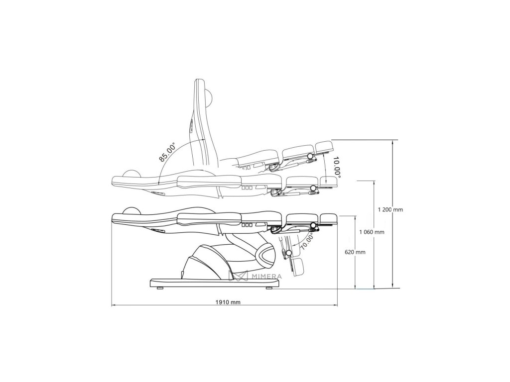 - 3 motory pro nastavení výšky (62-106 cm, do výšky 120cm v kolébce), opěradla (0 ° ~ + 85 °), náklonu sedáku (- 4 ° ~ + 10 °) a opěrky na nohy (- 70 ° ~ 0 °)