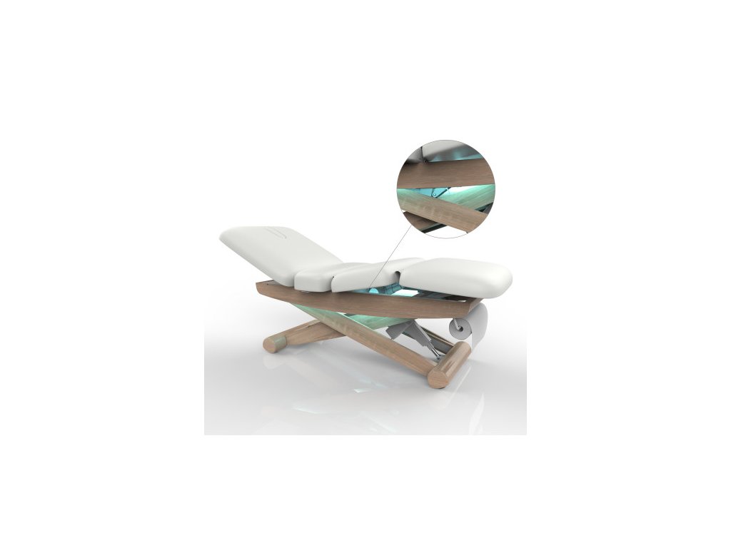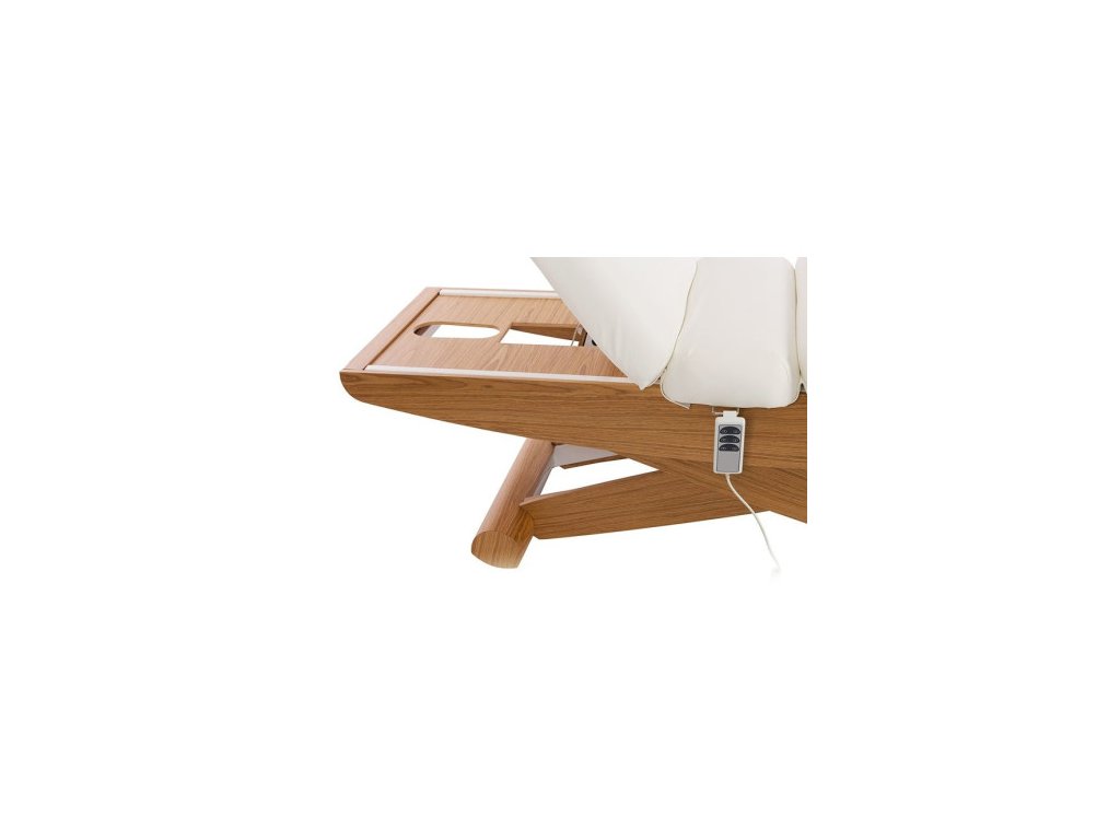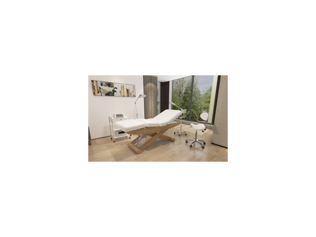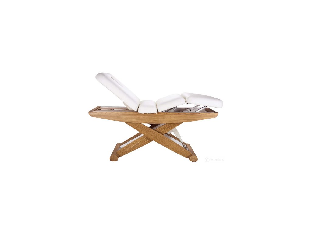 Lehátko má kovovou konstrukci nůžkového tvaru, s dřevěným ukončením, což z něj činí zajímavý interiérový doplněk ve studiu. Komfortní polstrování vysoké kvality s odolným PU povrchem zároveň usnadňuje čištění. Lehátko má výřez na obličej.