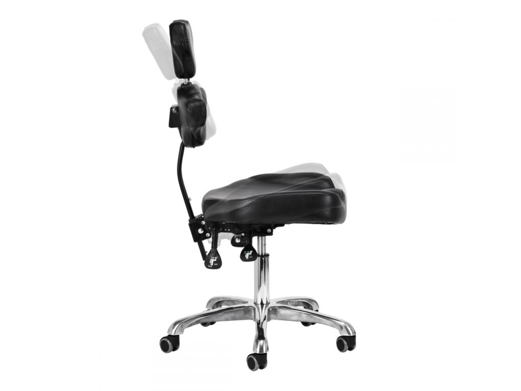 Pětihvězdičková základna zajišťuje stabilitu při používání. Efektivní kolečka umožňují volný pohyb křesla , což výrazně usnadňuje dosažení potřebného náčiní a umístění do správné pracovní polohy. Profilovaný sedák a opěrák jsou vyplněny odolnou pěnou, čalounění je vyrobeno z imitace kůže v odstínech černé. Použité materiály usnadňují čištění křesla , což usnadňuje dodržování vysokých hygienických standardů. Taburetka díky svému netradičnímu vzhledu dokonale zapadá do specifické estetiky tetovacích salonů .